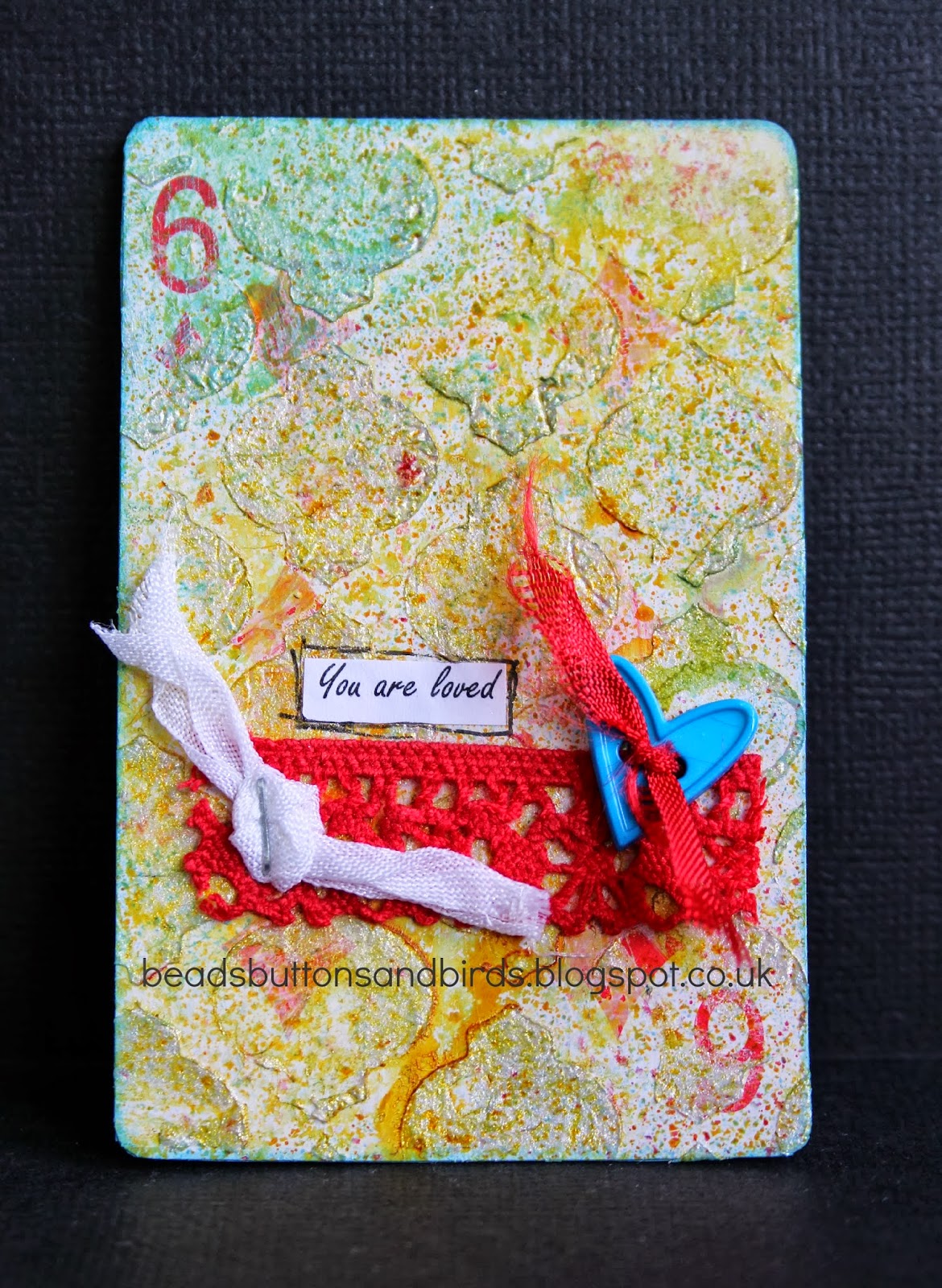 I used lace, heart buttons and seam binding from Crafty Ribbons, a recycled box and a suit of playing cards.